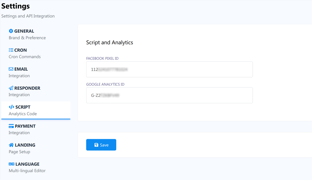 To begin tracking your website visitors with Facebook Pixel or Google Analytics, simply add the code (not the full JS scipt only ID) provided by the respective platform. Once the code is added, the analytics script will be automatically loaded on your app landing page, allowing you to start gathering valuable data on your website traffic and user behavior. With this information, you can make informed decisions about your marketing strategy and optimize your website to improve engagement and drive conversions.